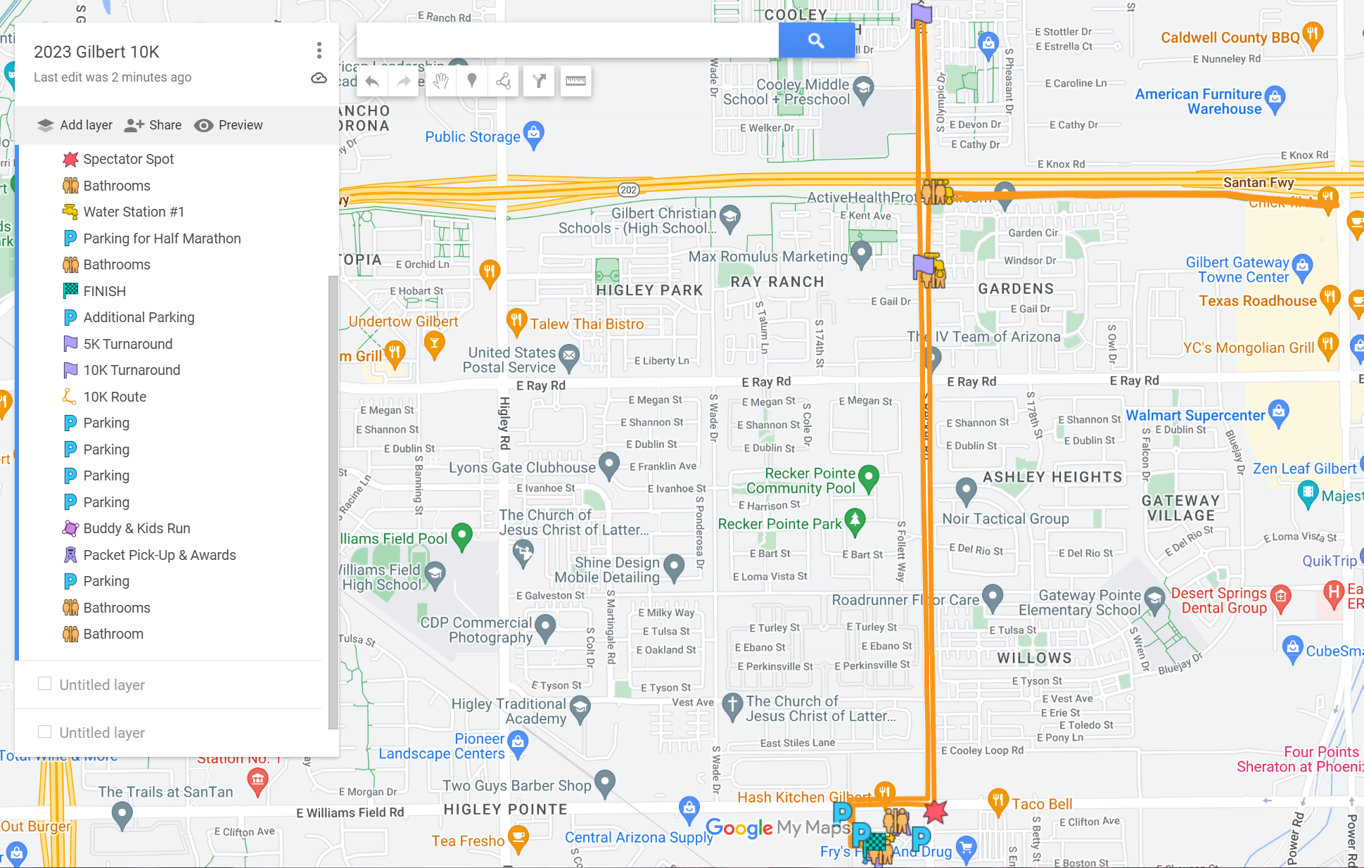 For the early birds, parking is available at Verde@Cooley Station. If you are participating in the 10k or 5k or do not want to deal with traffic delays, parking on Recker Road at Legacy Traditional School, Higley School District offices, the LDS church, or Higley High School coming from Pecos Road north-bound on Recker Road are all great options.